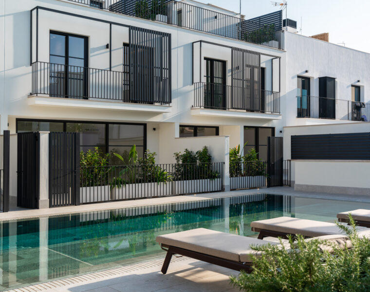 Exklusives 3-Zimmer-Reihenhaus in Portixol mit Dachterrasse, südlich ausgerichteten Terrassen und Zugang zu privatem Pool und Gärten.
