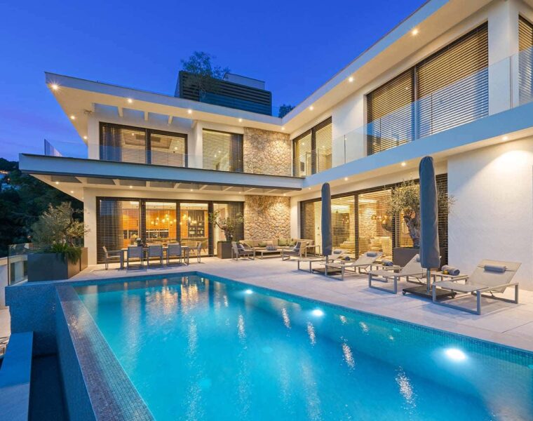 Moderne Villa in Nova Santa Ponsa, Calvià, mit vier Schlafzimmern plus Gästesuite, Fußbodenheizung, Aufzug, privatem Pool und Lage in unmittelbarer Nähe zu Port Adriano.