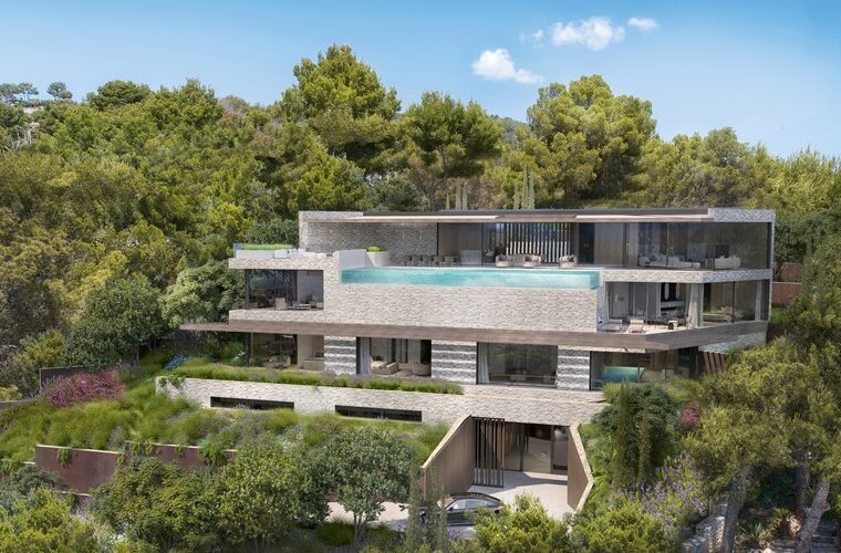 Moderne Meerblick-Villa in Costa d’en Blanes mit fünf Schlafzimmern, mehreren Terrassen, Salzwasserpool, Außenküche und großem Grundstück nahe Palma und Puerto Portals.