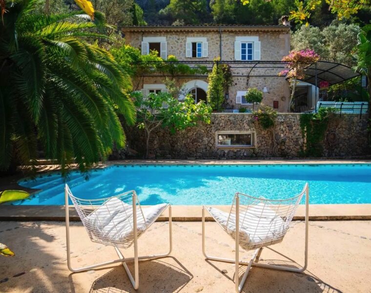Finca Tramuntana in Santa Maria del Camí: Luxusvilla mit fünf Schlafzimmern, beheiztem Pool, Helipad, Gärten, Terrassen und Bergblick.