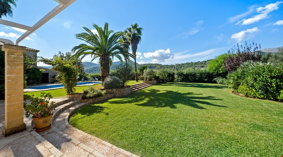 Im Außenbereich lädt die Finca zu entspannten Tagen unter freiem Himmel ein. Im Zentrum des Anwesens befindet sich ein großer Pool, umgeben von Sonnenterrassen, einer überdachten Grillveranda und einem gepflegten mediterranen Garten mit herrlichem Blick auf die Tramuntana-Berge.