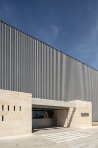 Das Gebäude wurde vom Studio AR3 arquitectes entworfen und zeichnet sich durch seine klare und nachdrückliche Volumetrie aus, die sich mit einer Metallfassade in die Landschaft einfügt, die ihre Farbe mit dem Sonnenlicht ändert und mit einer Sandsteinmauer kontrastiert, die den Eingang hervorhebt und den Eintritt von natürlichem Licht in das Gebäude filtert und den Besuchern ein einzigartiges Erlebnis bietet.