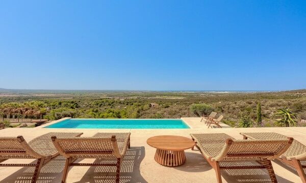 Luxury finca near Es Trenc beach with panoramic sea views, private pool, and landscaped gardens, offering a unique blend of modern and traditional design.