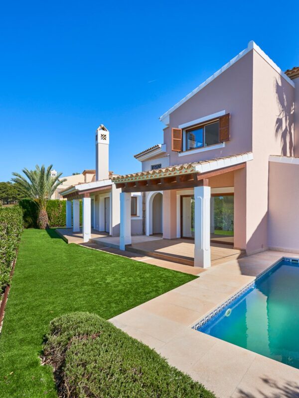 Moderne Villa mit drei Schlafzimmern in Santa Ponsa, Blick auf den Golfplatz, privatem und gemeinschaftlichem Pool sowie lichtdurchfluteten Räumen im mediterranen Stil.