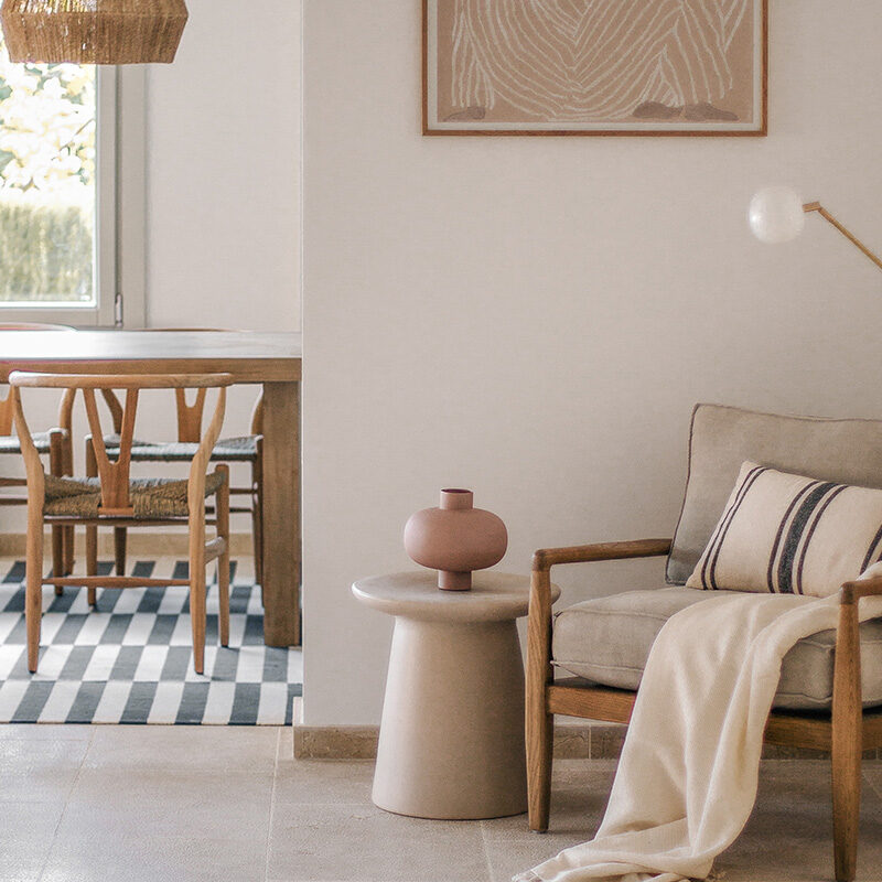 In Anlehnung an die natürliche Umgebung verwendeten sie Materialien wie Eiche, Rattan und Bambus, um dem Haus Charakter und Intimität zu verleihen: „Wir wollten einen Raum schaffen, der schon beim Betreten des Hauses einladend wirkt“, erklärt Anna. Die Wände wurden in blanco roto gestrichen, um den Innenräume Wärme zu verleihen, und die vorhandenen Steinfliesen wurden mit einer speziellen Abujardado-Schleiftechnik bearbeitet, um ihnen einen weicheren, rustikalen Charakter zu geben. Zu den moderneren Aspekten gehören die Mikrozementböden in allen Bädern, die einen kühlen Kontrapunkt zu den wärmeren, wohnlicheren Elementen bilden. Designer-Leuchten im gesamten Haus sorgen für einen Hauch von schickem, modernem Design, mit Leuchten von Top-Marken wie Cestita, Miguel Milá und Menu Space.