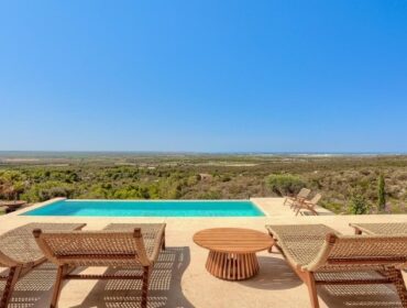 Luxury finca near Es Trenc beach with panoramic sea views, private pool, and landscaped gardens, offering a unique blend of modern and traditional design.