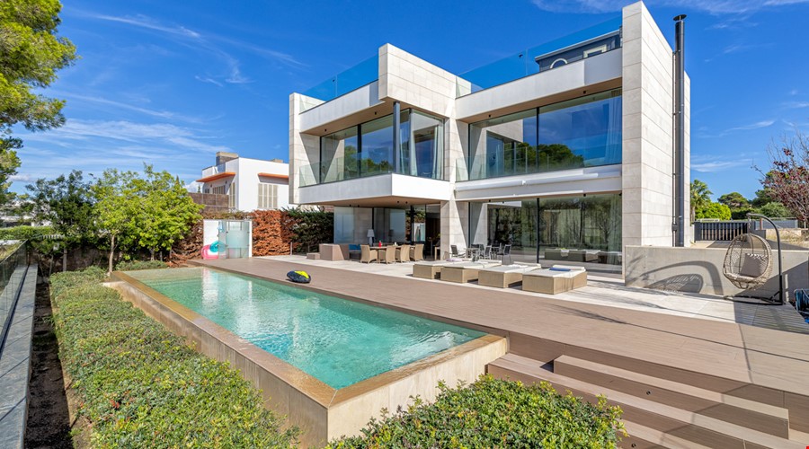 Im Obergeschoss befinden sich drei Schlafzimmer, jeweils mit eigenem Bad und Ankleidebereich, alle mit eindrucksvollem Blick über die Bucht von Palma. Auf der Dachterrasse befindet sich eine Sauna, ein privater Rückzugsort zum Entspannen mit Blick auf die Küste.