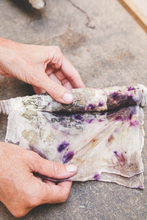 Das zeigt sich auch in ihrem eigenem Schaffen, in dem Naturfarben auf verschiedensten Oberflächen eine Rolle spielen – von Papier über Seide bis hin zu den Garnen. Vor drei Jahren nahm sie an einem Naturfarben-Workshop teil und war sofort Feuer und Flamme. Es folgte ein Workshop zum Eco-Printing, bei dem Blumen oder Pflanzen auf die Oberfläche gelegt und dann fest angedrückt werden. In ihrem Geschäft bietet sie diverse Schals in zartestem Rosa an, gefärbt mit Avocado, und wunderschöne Strickgarne in allen möglichen Tönen, gefärbt mit Zutaten wie schwarzen Oliven oder Kurkuma.