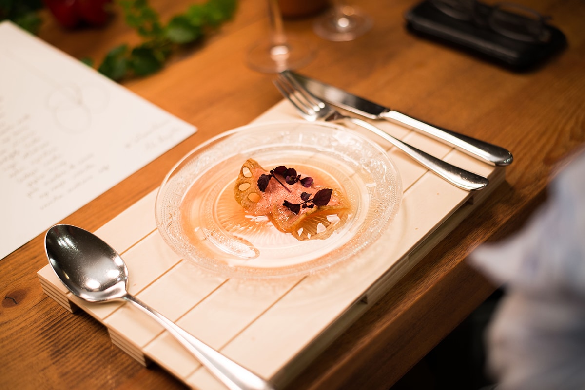 Die zahlreichen Highlights des unvergesslichen Dinners beinhalteten: ein sehr schmackhaftes Tomatenwasser Gazpacho mit Kaviar-Kirschen, Crème fraîche und gefrorenen Kräutern ‘escarcha’ (als Tribut an Joël Robuchon), Rodrigos selbstgemachte Butter und köstliches Brot, sowie das ausgezeichnete ‘quinotto’ – ein Risotto aus Quinoa. Wir kosteten ungewöhnliche Zutaten, wie z.B. Huacatay (peruanische, schwarze Minze), Spirulina-Algen und Chlorella, Oxalis (Sauerklee), Meeresfenchel, Wasserbrotwurzel und viele andere. Seine Cuisine ist eine Offenbarung und revolutionär … das Essen der Zukunft.