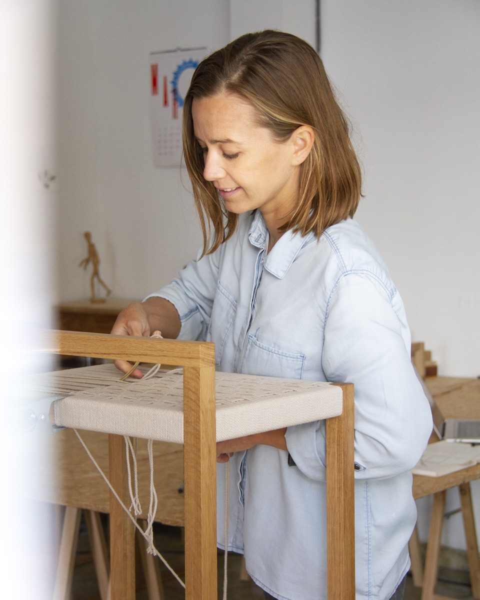 Heute entwirft und fertigt sie moderne Möbel, die von diesen traditionellen Techniken inspiriert sind. Ihre charakteristischen Stücke sind geflochtene Hocker, Bänke und Nachttische, die aus recycelter Baumwollkordel hergestellt werden, die in Spanien gesponnen und manchmal mit Hanf gemischt wird, und mit lokalem Eichenholz gerahmt sind. Jedes Design ist bewusst gewählt. „Die Geometrie spricht“, erklärt sie und verweist dabei auf ihre Inspiration durch architektonische Linien, natürliche Farbverläufe und lokale Motive wie sonnenverblasste Zäune und Schattengitter. Jedes Stück trägt den Namen einer Frau: Großmütter, Töchter, Freundinnen – stille Hommagen an diejenigen, die sie geprägt haben.