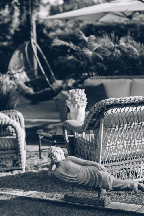 Da sich die Villa Wesco auf den mediterranen Lebensstil konzentriert, ist es nicht verwunderlich, dass der Außenbereich großzügig gestaltet ist. Die gefliesten Böden werden vom Sonnenlicht durchflutet, und das Plätschern des Wassers ist beruhigend. Es gibt sogar eine Katze, die sich neben einem glitzernden Swimmingpool putzt. Von Lounge-Sets und Sonnenschirmen bis hin zu Tischen aus Massivholz und knorrigen Bänken, die aus ganzen Bäumen gefertigt wurden, lässt die Auswahl kaum etwas zu wünschen übrig. „Manutti, Solpuri, Glatz, Tucci, bmbItaly…“ Ana Lado zählt einige der exklusiven Marken auf, die sie ausgewählt haben. Wir stellen uns Nachmittage vor, an denen wir in den fabelhaften Designer-Sesseln schwelgen und gemütlich im Freien essen.