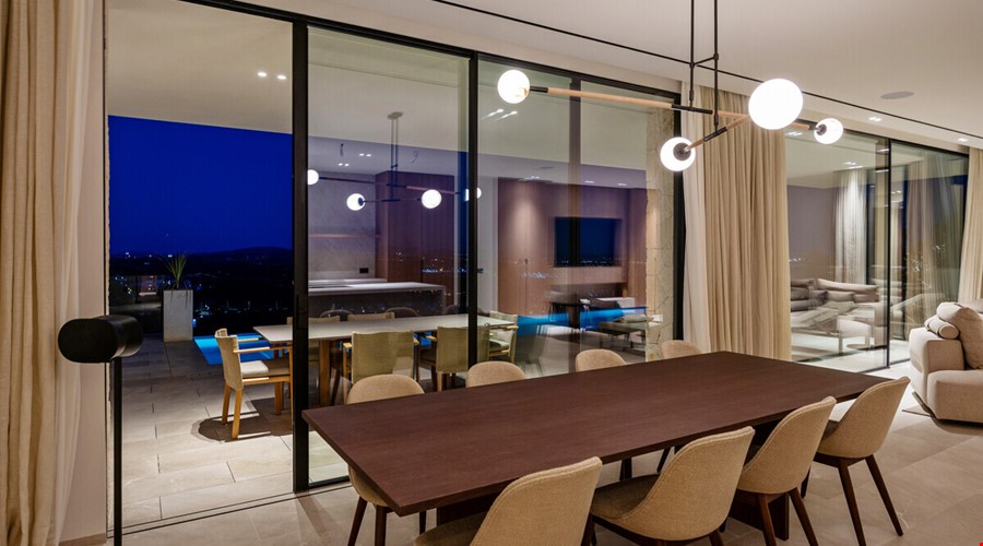 Mit einer bebauten Fläche von 966 m², verteilt auf drei Etagen, beeindruckt die Villa durch klare Linien, natürliche Materialien und eine lichtdurchflutete Atmosphäre. Im Erdgeschoss verschmelzen Küche, Essbereich und Wohnzimmer zu einem offenen Raumkonzept, das Großzügigkeit und Leichtigkeit vermittelt. Maßgefertigte Eichenholzarbeiten, verdeckte Türen und integrierte Schränke verleihen den Räumen Wärme und eine harmonische Ästhetik.